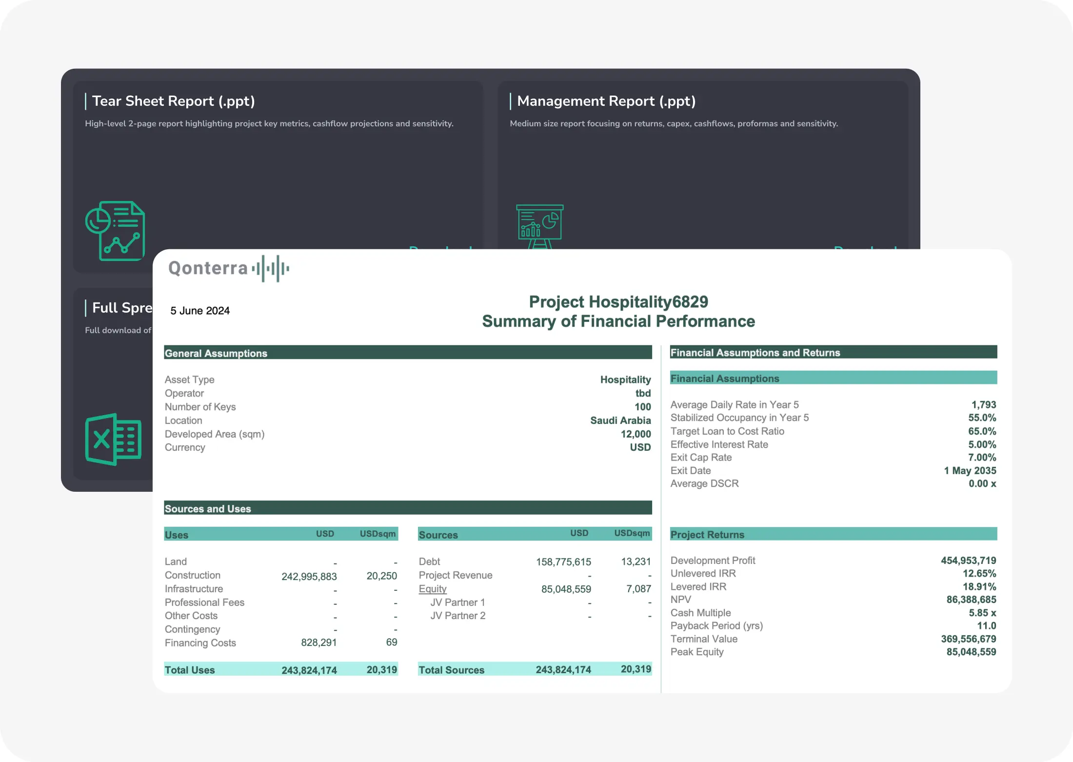 The Qonterra engine makes financial modeling easy and fast while maintaining high level of accuracy. Our audited proprietary model assures accuracy of any financial model without MS Excel errors. It is designed on a clear structure for fast underwriting, updating, tracking, filing and sharing of projects.
